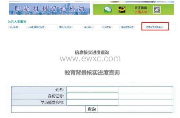 进入上海人才服务网首页,点击“信息核实进度查询”——填写姓名、身份证号、学历颁发机构后点击“查询”。