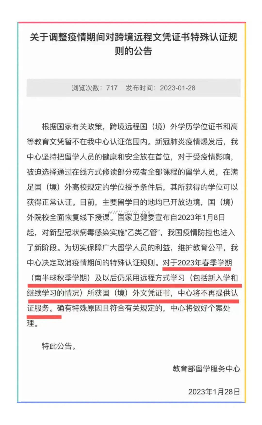 根据国家有关政策,通过跨境远程学习方式获得的国(境)外学历学位证书和高等教育文凭一直不在我中心认证范围。新冠肺炎疫情爆发后,我中心坚持把留学人员的健康和安全放在首位,对于受疫情影响,被迫选择通过在线方式修读部分或者全部课程的留学人员,在满足国(境)外高校规定的学位授予条件后,其所获得的学位可以获得正常认证。本次《公告》只是取消了疫情期间的特殊做法,恢复了原有的认证规则。