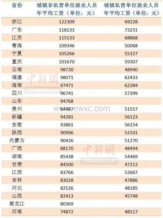 从公布结果来看,25省中只有浙江,广东,江苏,青海,宁夏,重庆这6省,城镇非私营单位就业人员的年平均工资在10万元以上。其中,浙江,广东,江苏3个省城镇私营单位就业人员年平均工资也超过了全国私营单位就业人员平均工资62884元。